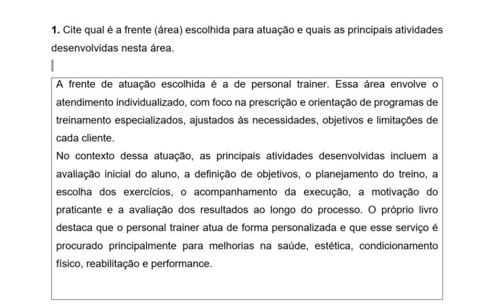 A frente de atuação escolhida é a de personal trainer. Essa área envolve o atendimento individualizado, com foco na prescrição e orientação de programas de treinamento especializados, ajustados às necessidades, objetivos e limitações de cada cliente.
