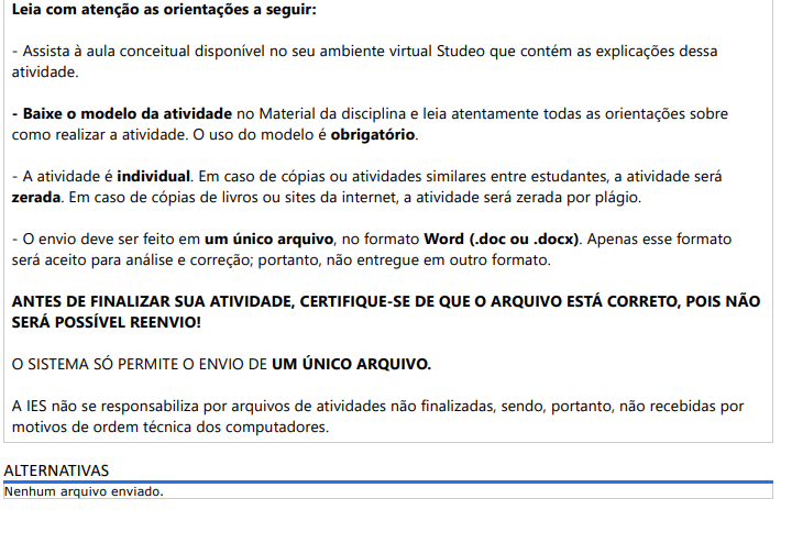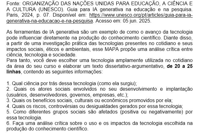 Período: 21/07/2025 08:00 a 03/08/2025 23:59 (Horário de Brasília)Status: ABERTONota máxima: 2,00Gabarito: Gabarito será liberado no dia 04/08/2025 00:00 (Horário