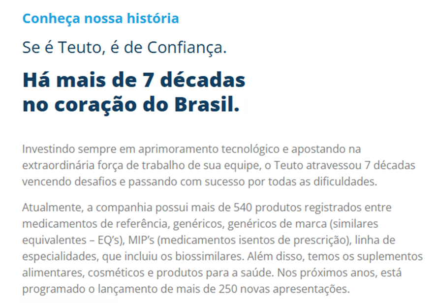 A estratégia de posicionamento utilizada no exemplo da empresa Teuto é focada em tradição, confiança e credibilidade. A marca destaca sua atuação no mercado há mais de sete décadas, o que transmite solidez e experiência. Além disso, menciona o uso de tecnologia e a qualificação de sua equipe, reforçando um posicionamento que combina tradição com inovação.