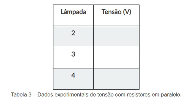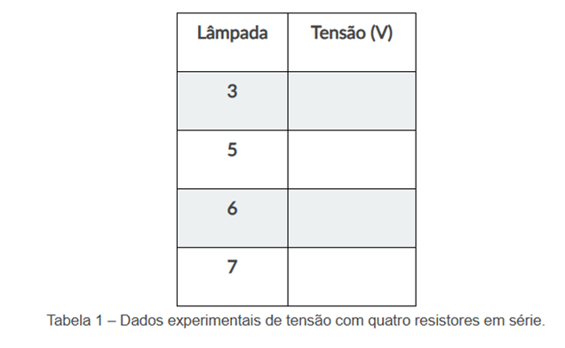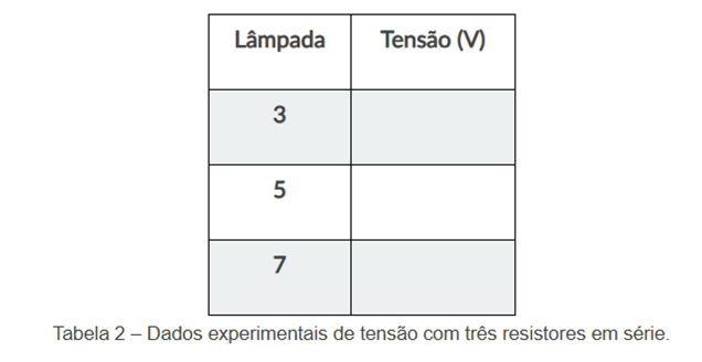 c) Com base em suas observações, comente a veracidade da seguinte afirmação: “Em uma associação em série a soma das tensões elétricas sobre cada componente (lâmpada) é igual a tensão elétrica total atuante no circuito.”