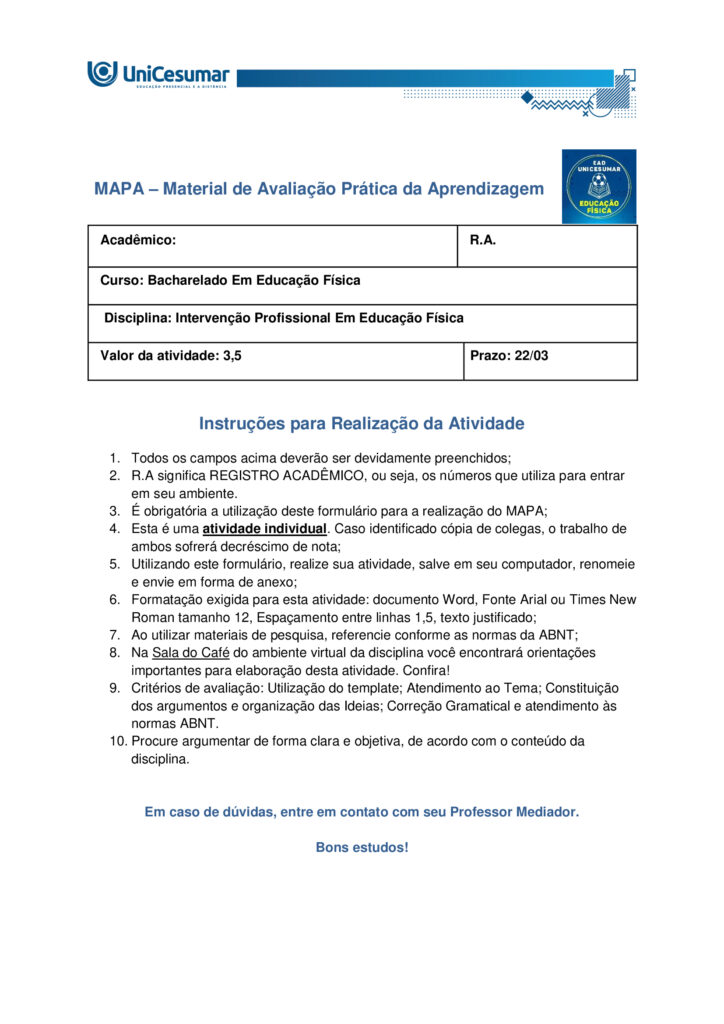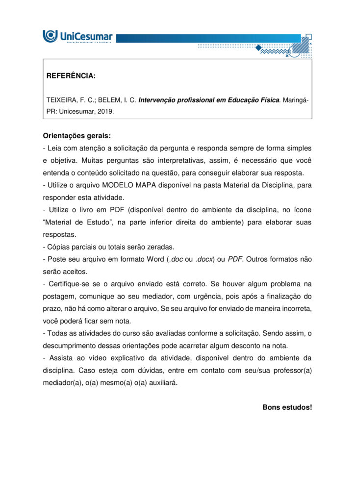 TEIXEIRA, F. C.; BELEM, I. C. Intervenção Profissional em Educação Física. Maringá-PR: Unicesumar, 2019.