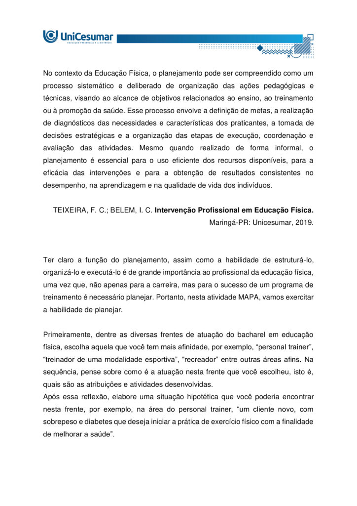 TEIXEIRA, F. C.; BELEM, I. C. Intervenção profissional em Educação Física. Maringá-PR: Unicesumar, 2019.