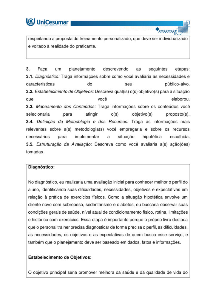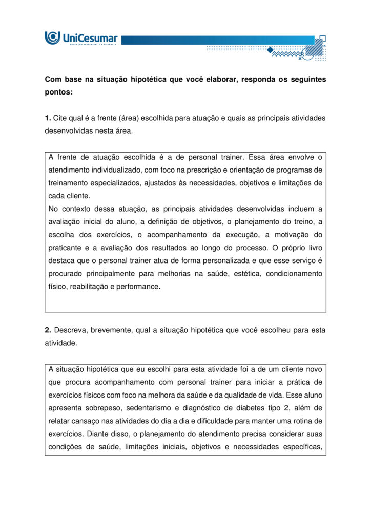 Após essa reflexão, elabore uma situação hipotética que você poderia encontrar nesta frente, por exemplo, na área do personal trainer, “um cliente novo, com sobrepeso e diabetes que deseja iniciar a prática de exercício físico com a finalidade de melhorar a saúde”.
