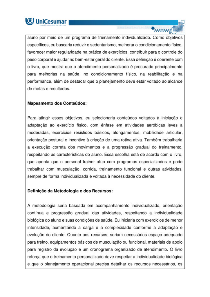 A metodologia seria baseada em acompanhamento individualizado, orientação contínua e progressão gradual das atividades, respeitando a individualidade biológica do aluno e suas condições de saúde. Eu iniciaria com exercícios de menor intensidade, aumentando a carga e a complexidade conforme a adaptação e evolução do cliente. Quanto aos recursos, seriam necessários espaço adequado para treino, equipamentos básicos de musculação ou funcional, materiais de apoio para registro da evolução e um cronograma organizado de atendimento. O livro reforça que o treinamento personalizado deve respeitar a individualidade biológica e que o planejamento operacional precisa detalhar os recursos necessários, os procedimentos básicos, os resultados esperados, os prazos e os responsáveis pela execução.