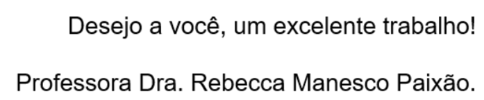 - O trabalho pode ter quantas páginas você precisar para respondê-lo, desde que siga a sua estrutura. Preferencialmente, utilizar a formatação: fonte Arial 12, espaçamento entre linhas 1,5 linhas e texto justificado.