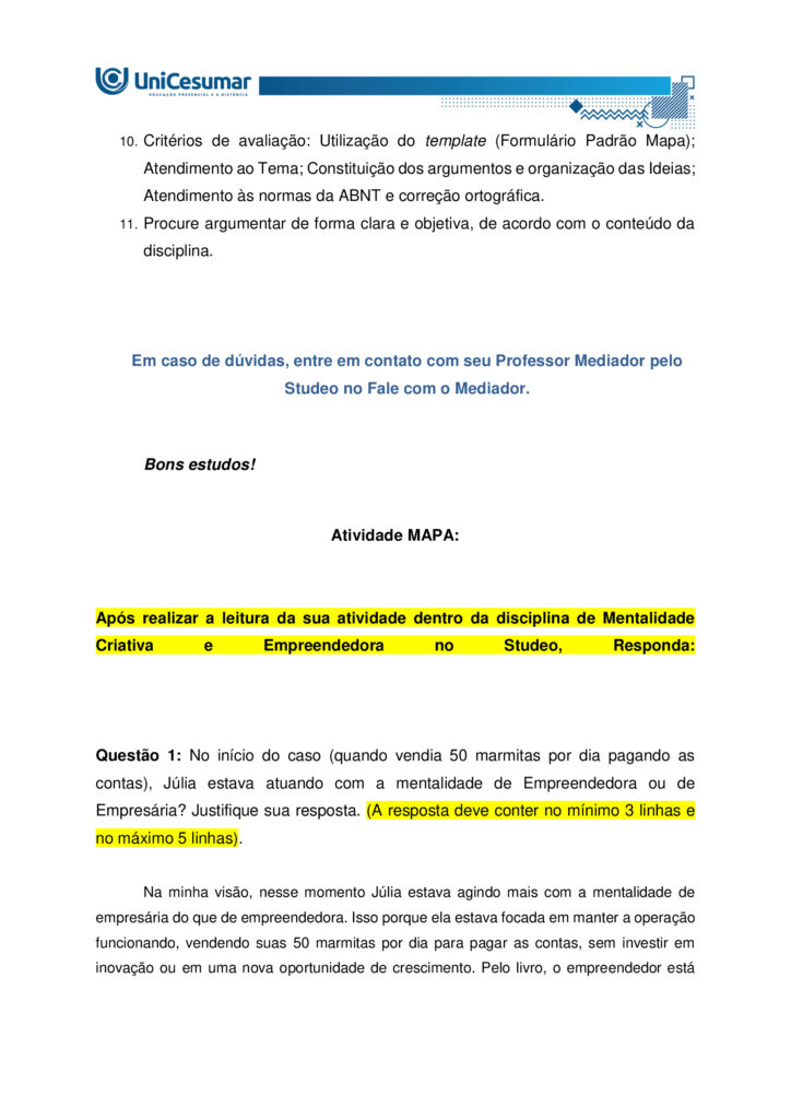 Questão 1: No início do caso (quando vendia 50 marmitas por dia pagando as contas), Júlia estava atuando com a mentalidade de Empreendedora ou de Empresária? Justifique sua resposta. (A resposta deve conter no mínimo 3 linhas e no máximo 5 linhas).