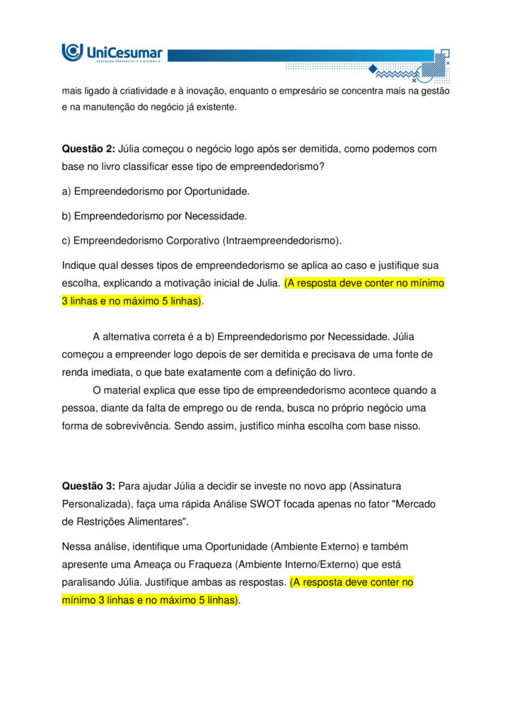 Questão 2: Júlia começou o negócio logo após ser demitida, como podemos com base no livro classificar esse tipo de empreendedorismo?