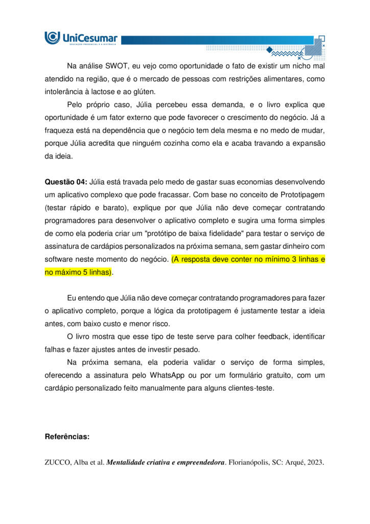 Questão 04: Júlia está travada pelo medo de gastar suas economias desenvolvendo um aplicativo complexo que pode fracassar. Com base no conceito de Prototipagem (testar rápido e barato), explique por que Júlia não deve começar contratando programadores para desenvolver o aplicativo completo e sugira uma forma simples de como ela poderia criar um “protótipo de baixa fidelidade” para testar o serviço de assinatura de cardápios personalizados na próxima semana, sem gastar dinheiro com software neste momento do negócio. (A resposta deve conter no mínimo 3 linhas e no máximo 5 linhas).