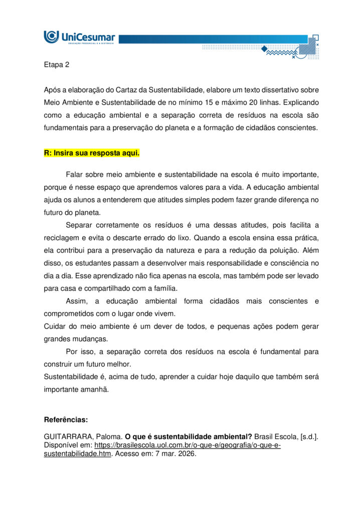 Após a elaboração do Cartaz da Sustentabilidade, elabore um texto dissertativo sobre Meio Ambiente e Sustentabilidade de no mínimo 15 e máximo 20 linhas. Explicando como a educação ambiental e a separação correta de resíduos na escola são fundamentais para a preservação do planeta e a formação de cidadãos conscientes.