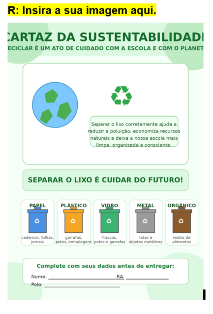 Você deverá criar um cartaz digital sobre sustentabilidade, utilizando a plataforma Canva (www.canva.com), com o objetivo de conscientizar seus colegas sobre a importância da reciclagem.