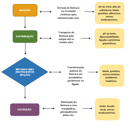 1) ELABORE um fluxograma demonstrando as etapas do processo farmacocinético de um fármaco administrado por via oral: absorção, distribuição, metabolismo (ou biotransformação) e excreção, sem especificar uma classe de medicamento.  O fluxograma deve apresentar uma definição de cada das etapas e anotações explicativas sobre fatores que podem alterar cada processo (ex.: idade, genética, outros medicamentos). – Dicas de organização: Use setas para indicar a sequência das etapas; diferencie cada etapa com cores e formas. Você pode desenhar o fluxograma à mão ou utilizando programas de computador (word, powerpoint, canva, etc).