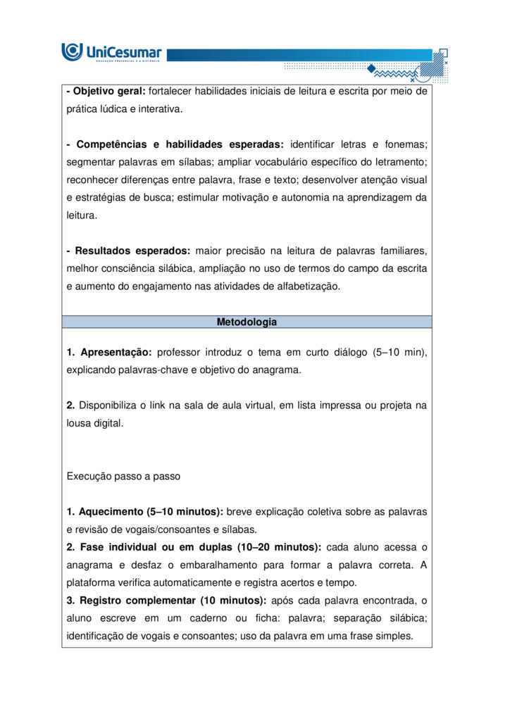 | 1. Apresentação: professor introduz o tema em curto diálogo (5–10 min), explicando palavras-chave e objetivo do anagrama. 2. Disponibiliza o link na sala de aula virtual, em lista impressa ou projeta na lousa digital. Execução passo a passo 1. Aquecimento (5–10 minutos): breve explicação coletiva sobre as palavras e revisão de vogais/consoantes e sílabas. 2. Fase individual ou em duplas (10–20 minutos): cada aluno acessa o anagrama e desfaz o embaralhamento para formar a palavra correta. A plataforma verifica automaticamente e registra acertos e tempo. 3. Registro complementar (10 minutos): após cada palavra encontrada, o aluno escreve em um caderno ou ficha: palavra; separação silábica; identificação de vogais e consoantes; uso da palavra em uma frase simples. 4. Atividade de extensão (10–15 minutos): em grupos, alunos trocam palavras e criam pequenas rimas, frases coletivas ou mini-textos que incluam 3 a 4 palavras trabalhadas. 5. Fechamento e avaliação formativa (10 minutos): compartilhamento oral de produções, feedback do professor sobre acertos comuns e dificuldades, planejamento de intervenções. Regra da atividade – Meta ideal: encontrar todas as palavras; meta adaptada para iniciantes: encontrar pelo menos 8 a 10. – Tempo sugerido por palavra: 30–90 segundos (ajustável conforme nível). – Tentativas: permitir múltiplas tentativas com penalização de tempo para forçar reflexão, ou bloquear após 3 tentativas para estimular consulta ao colega. – Critérios de avaliação: número de acertos, tempo médio por palavra, qualidade da separação silábica e das frases de uso. | |