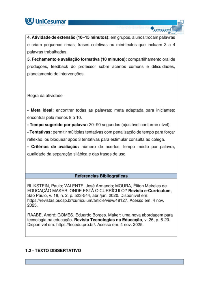 | BLIKSTEIN, Paulo; VALENTE, José Armando; MOURA, Éliton Meireles de. EDUCAÇÃO MAKER: ONDE ESTÁ O CURRÍCULO? Revista e-Curriculum, São Paulo, v. 18, n. 2, p. 523-544, abr./jun. 2020. Disponível em: https://revistas.pucsp.br/curriculum/article/view/48127. Acesso em: 4 nov. 2025. RAABE, André; GOMES, Eduardo Borges. Maker: uma nova abordagem para tecnologia na educação. Revista Tecnologias na Educação, v. 26, p. 6-20. Disponível em: https://tecedu.pro.br/. Acesso em: 4 nov. 2025. | |