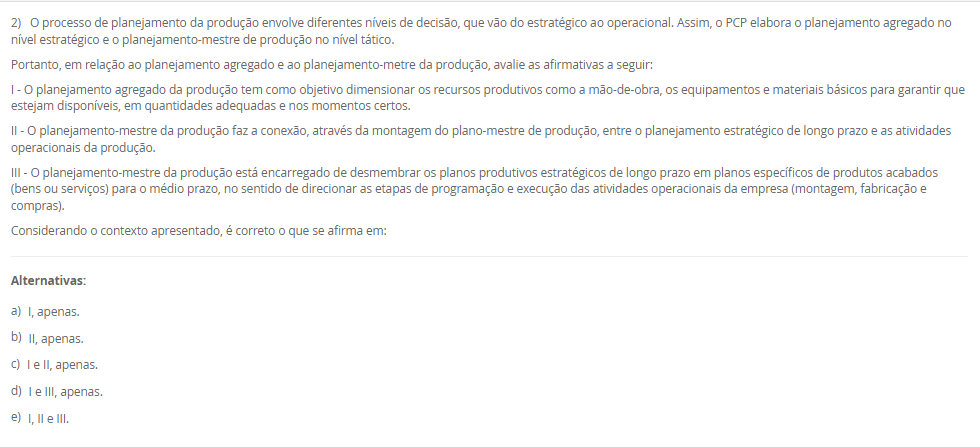 Portanto, em relação ao planejamento agregado e ao planejamento-metre da produção, avalie as afirmativas a seguir: