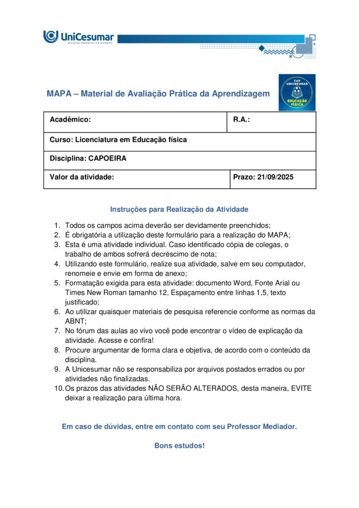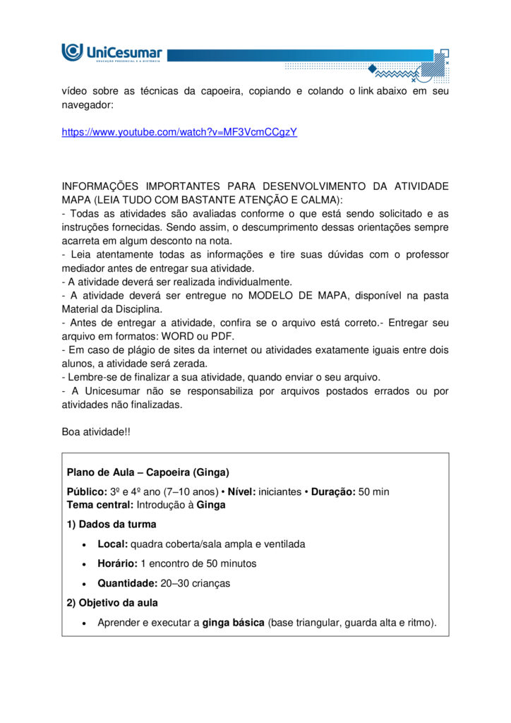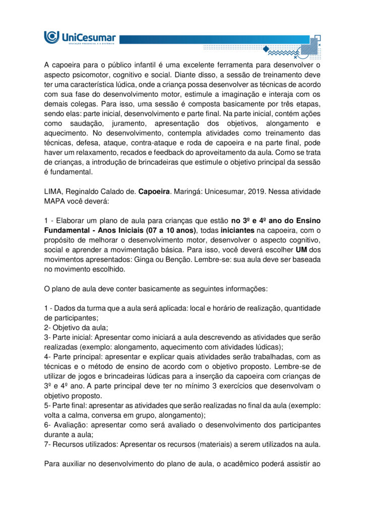 LIMA, Reginaldo Calado de. Capoeira. Maringá: Unicesumar, 2019. Nessa atividade MAPA você deverá:
