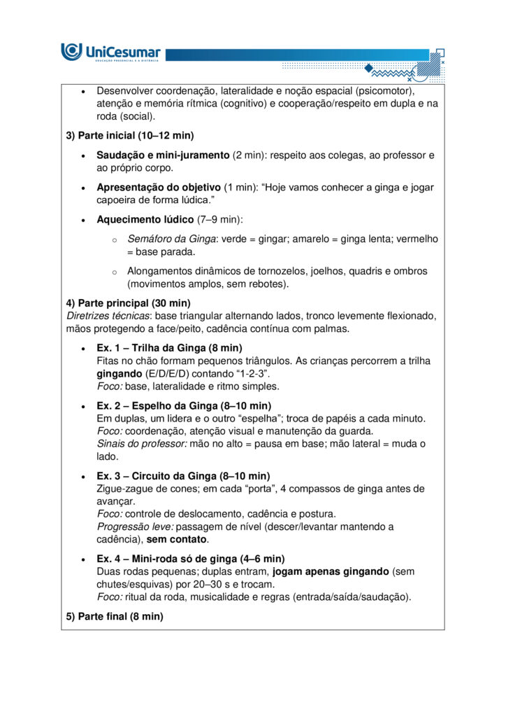1 – Elaborar um plano de aula para crianças que estão no 3º e 4º ano do Ensino Fundamental – Anos Iniciais (07 a 10 anos), todas iniciantes na capoeira, com o propósito de melhorar o desenvolvimento motor, desenvolver o aspecto cognitivo, social e aprender a movimentação básica. Para isso, você deverá escolher UM dos movimentos apresentados: Ginga ou Benção. Lembre-se: sua aula deve ser baseada no movimento escolhido.