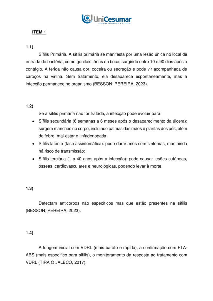 1.4) JUSTIFIQUE a importância do uso combinado dos testes não treponêmicos (VDRL) e treponêmicos(FTA-ABS) no diagnóstico da sífilis.