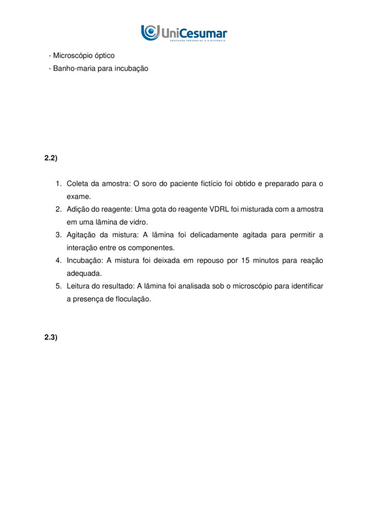2.2) DESCREVA como você realizou cada etapa do teste de VDRL, pelo método qualitativo.