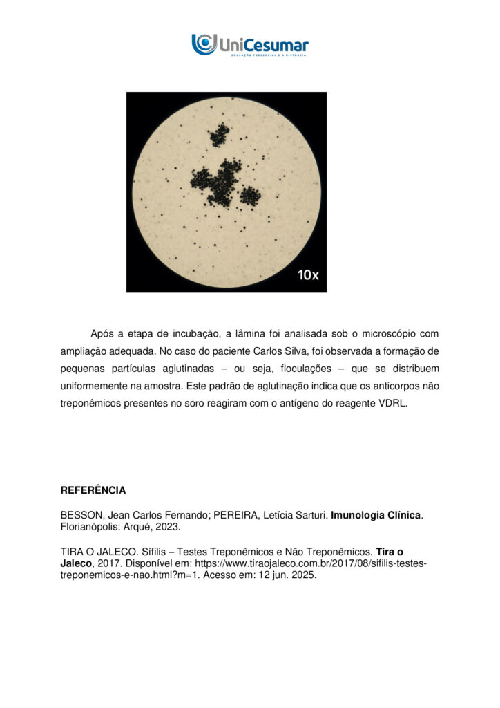 Após a etapa de incubação, a lâmina foi analisada sob o microscópio com ampliação adequada. No caso do paciente Carlos Silva, foi observada a formação de pequenas partículas aglutinadas – ou seja, floculações – que se distribuem uniformemente na amostra. Este padrão de aglutinação indica que os anticorpos não treponêmicos presentes no soro reagiram com o antígeno do reagente VDRL.