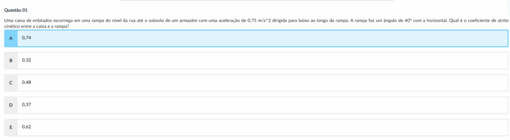 Comentário: Para calcular o coeficiente de atrito cinético: μ = (g * sin(θ) – a) / (g * cos(θ)) = (9,8 * sin(40°) – 0,75) / (9,8 * cos(40°)) ≈ 0,74.