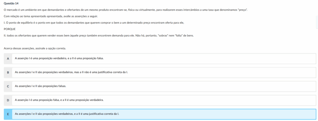 Comentário: No ponto de equilíbrio, há harmonia entre a demanda e a oferta, sem sobras ou faltas. Ambas proposições estão corretas e II justifica I.