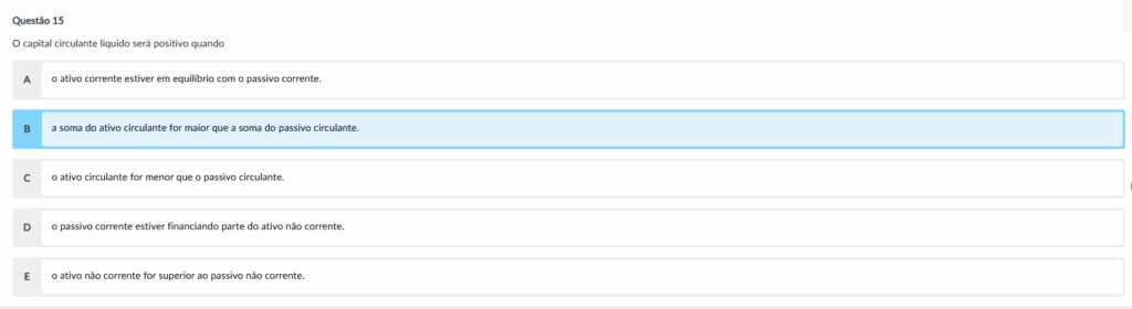 Gabarito: Letra B — a soma do ativo circulante for maior que a soma do passivo circulante.