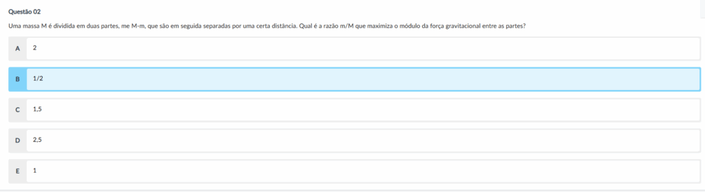 Comentário: A força gravitacional é máxima quando o produto m(M – m) é máximo. Isso ocorre quando m = M/2, ou seja, m/M = 1/2.