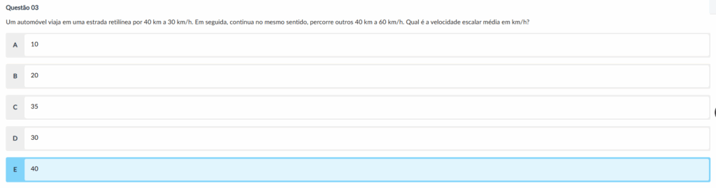 Um automóvel viaja em uma estrada retilínea por 40 km a 30 km/h. Em seguida, continua no mesmo sentido, percorre outros 40 km a 60 km/h. Qual é a velocidade escalar média em km/h?