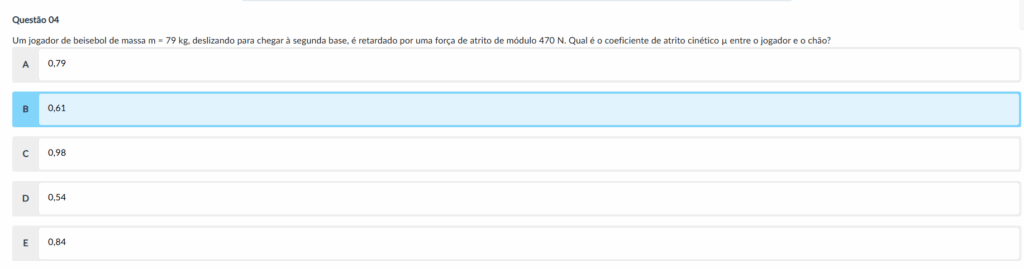 Um jogador de beisebol de massa m = 79 kg, deslizando para chegar à segunda base, é retardado por uma força de atrito de módulo 470 N. Qual é o coeficiente de atrito cinético μ entre o jogador e o chão?