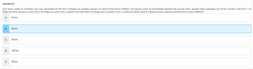 Dois trens, ambos se movendo com uma velocidade de 30 km/h, trafegam em sentidos opostos na mesma linha férrea retilínea. Um pássaro parte da extremidade dianteira de um dos trens, quando estão separados por 60 km, voando a 60 km/h, e se dirige em linha reta para o outro trem. Qual é a distância que o pássaro percorre até os trens colidirem?