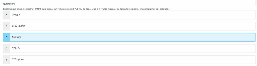 Comentário: Massa = 5700 * 1000 = 5.700.000 kg. Tempo = 10 h = 36000 s. Vazão = 5.700.000 / 36000 ≈ 158 kg/s.